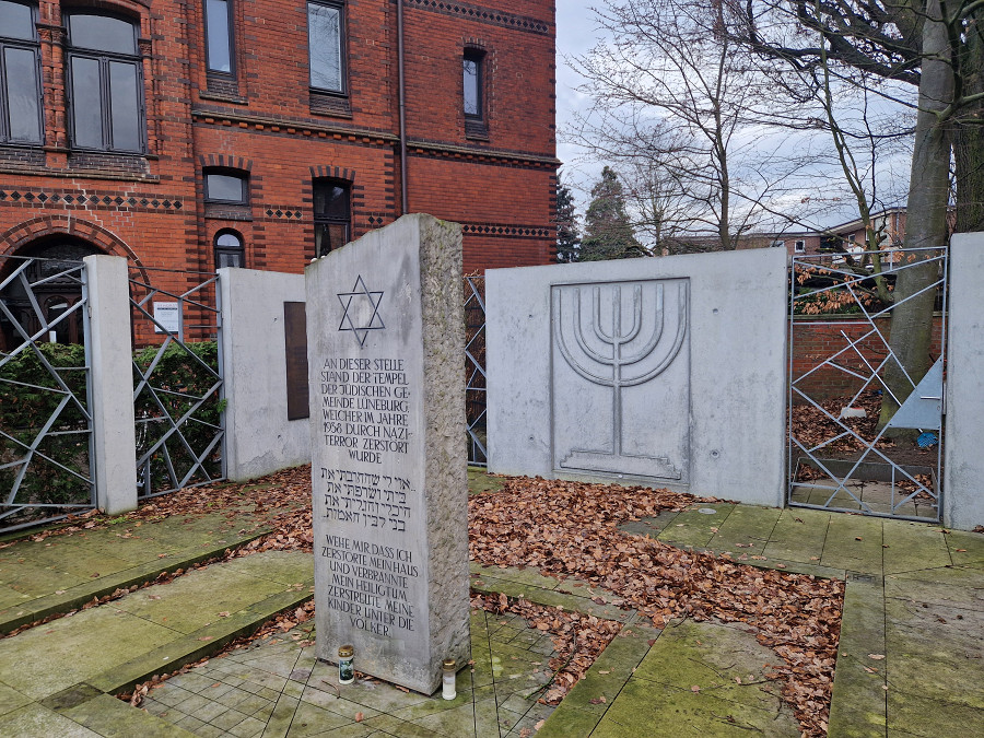 In Lüneburg erinnert seit dem 9. November 2018 eine Gedenkstätte am früheren Standort der Synagoge an das Gebäude sowie an 200 geflohene und vertriebene, deportierte und ermordete Jüdinnen und Juden.